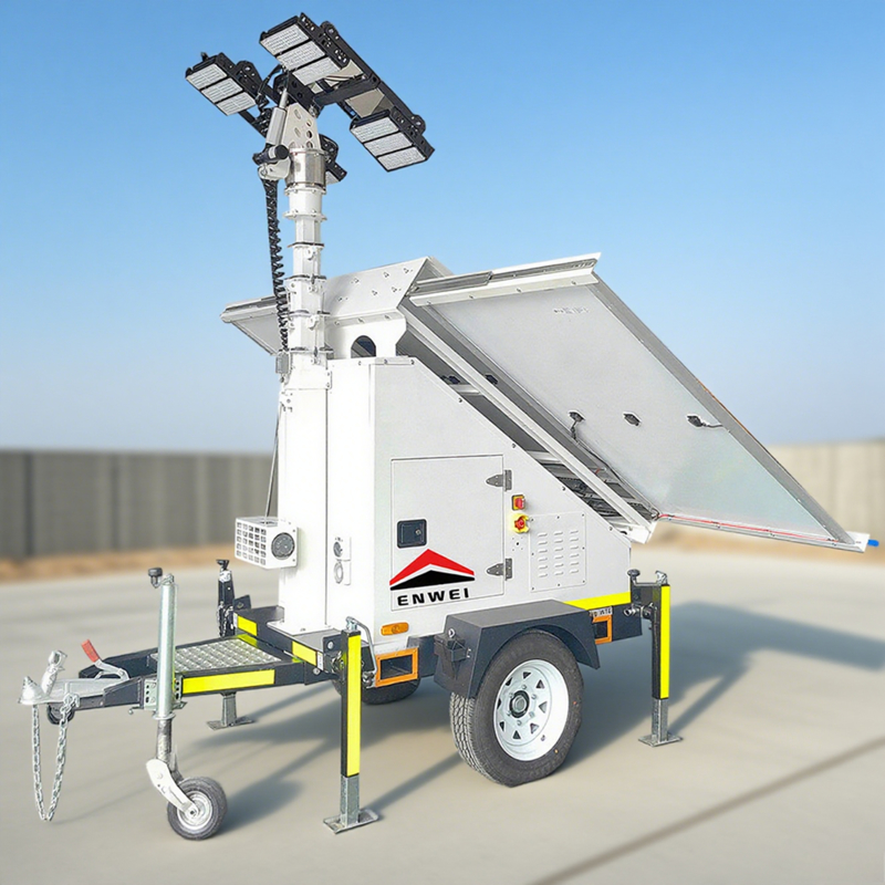 The mobile solar lighting trailer has excellent durability and applicability. The entire mobile solar lighting trailer is composed of a 7-meter electric mast, monocrystalline solar panels, gel batteries, cold-dipped galvanized mast, as well as wear-resistant tires and the trailer chassis, ensuring the overall usability of the mobile solar lighting trailer.